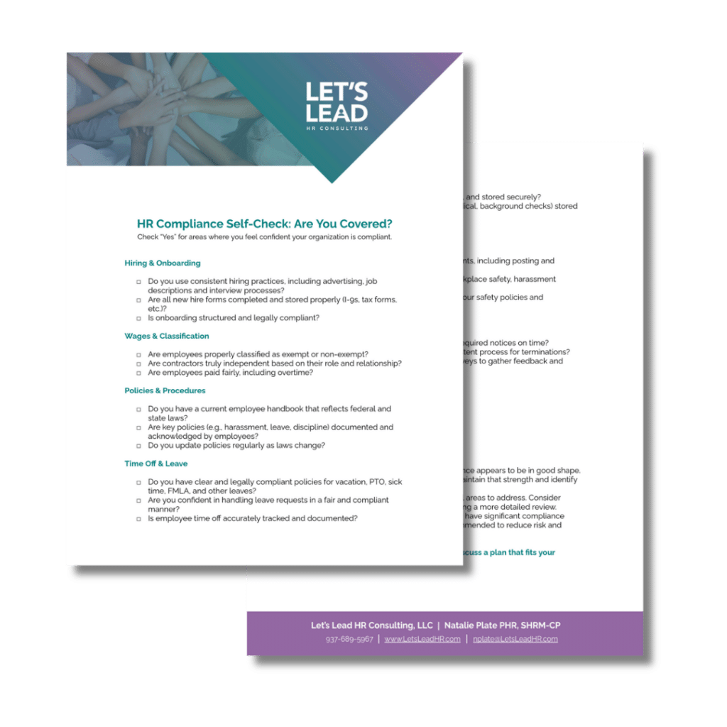 I’m Natalie, founder of Let’s Lead HR. I bring over 30 years of HR consulting and people management experience to small businesses that want to grow responsibly. I hold the SHRM-CP and PHR certifications, a BA in Organizational Management, and an OSHA 30 certification. I help companies strengthen compliance, improve employee engagement, and build practical, easy-to-use HR systems that support long-term growth.